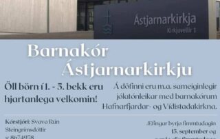 Barnakórstarf Ástjarnarkirkju hefst fimmtudaginn 15. september kl. 17:00 og verður á þeim sama tíma í vetur. Kórstýra er Svava Rún Steingrímsdóttir. Starfið er fyrir öll börn á aldrinum 6-10 ára. Skráning: barnakor@astjarnarkirkja.is Söngurinn bætir, hressir, kætir!
