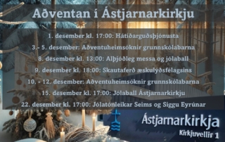 Seimur, Sigga Eyrún, Karl Olgeirsson, Lára Hall og Ásgeir J. Ásgeirsson. Fyrstu opinberu tónleikar hins nýstofnaða Seims, kórs Ástjarnarkirkju og Karls Olgeirssonar. Kórinn kemur fram ásamt Siggu Eyrúnu, Láru Hall, Ásgeiri Ásgeirssyni og Karli Olgeirssyni. Notaleg stund í aðgraganda jóla Jólatónleikarnir verða í Ástjarnarkirkju og hefjast klukkan 17:00. Miðaverð 3000 krónur. Hlekkur á Facebook